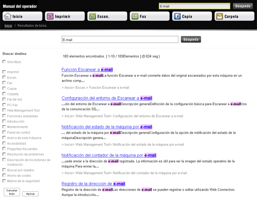 Introduzca una palabra clave en el campo de búsqueda en la parte superior del manual para buscar en el manual del operador. Introduzca cualquier palabra clave en el campo de entrada y haga clic en [Búsqueda].