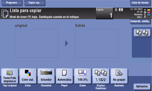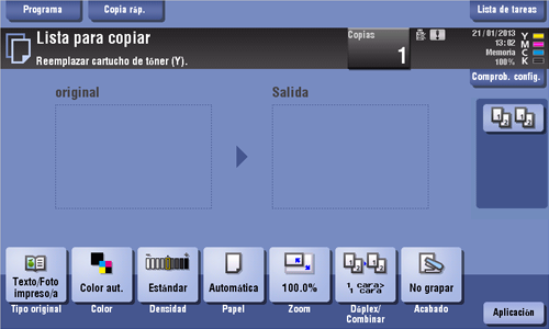 Compruebe el estado de los consumibles (nivel de consumo) utilizando el panel táctil. Si es necesario, es posible imprimir cada nivel en una lista.