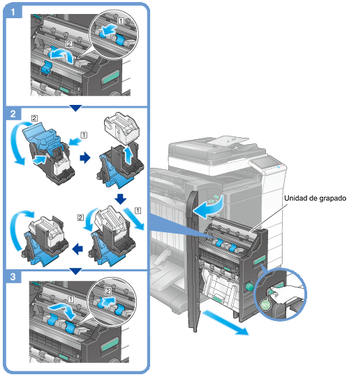 Asegúrese de reemplazar el cartucho de grapas después de que aparezca el mensaje correspondiente. Si el cartucho de grapas se retira antes de que aparezca el mensaje, se producirá un error.