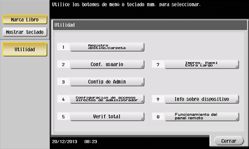 Toque [Utilidad] en el menú principal para visualizar los ajustes o el estado de uso de esta máquina.