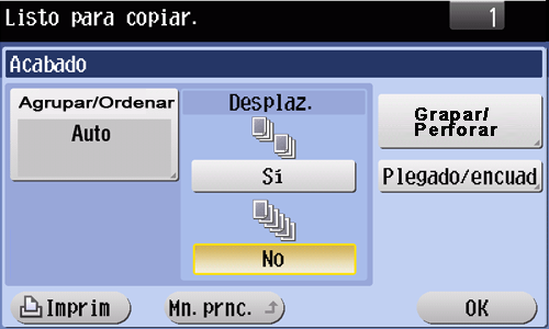 [Desplaz.] | Seleccione [Sí] al clasificar por copias o por páginas para expulsar el papel. Si se ha instalado una unidad de acabado o el separador de trabajos JS-506, las copias se expulsan y apilan una encima de otra, con cada juego de copias o páginas escalonado para separarlas. Si no se ha instalado una unidad de acabado o el separador de trabajos JS-506, las copias impresas se expulsan y clasifican según un patrón cruzado alternativo cuando se cumplen las siguientes condiciones.