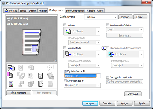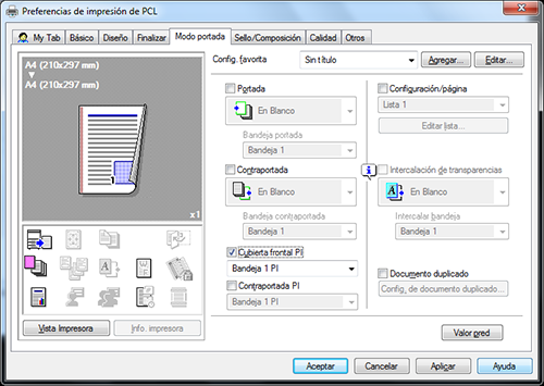 Seleccione [En Blanco] o [Imprimir] en [Portada] y una bandeja de papel en [Bandeja portada].