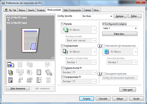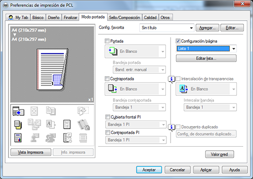 Para imprimir la portada en un tipo de papel diferente, seleccione la casilla de verificación [Portada] en la ficha [Modo portada].
