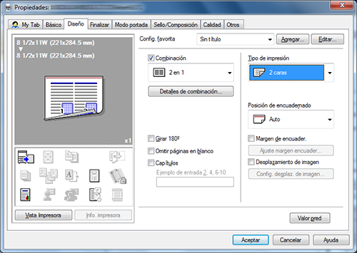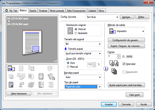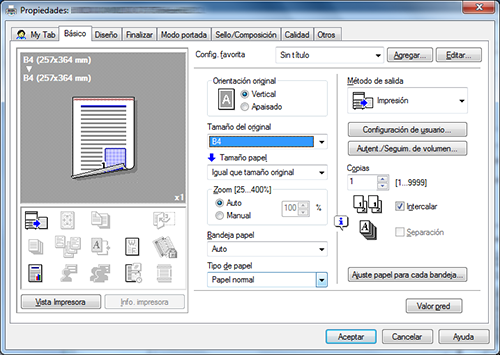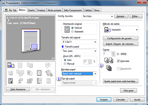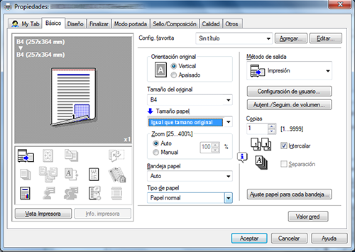 A15. Sí. Es posible personalizar de forma sencilla la ventana desde la ventana Propiedades del controlador de impresora registrando funciones utilizadas con frecuencia en masa en My Tab o registrando los ajustes para las correspondientes fichas como favoritos para una activación rápida.