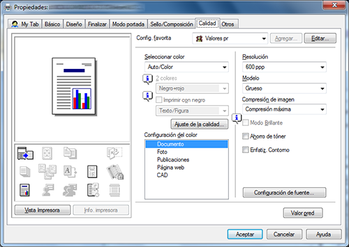 En [Configuración del color] en la ficha [Calidad], seleccione el tipo de documento que desea imprimir.