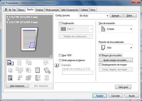 Para configurar el margen de la página, seleccione la casilla de verificación [Margen de encuader.] en la ficha [Diseño] y haga clic en [Ajuste margen encuader...].