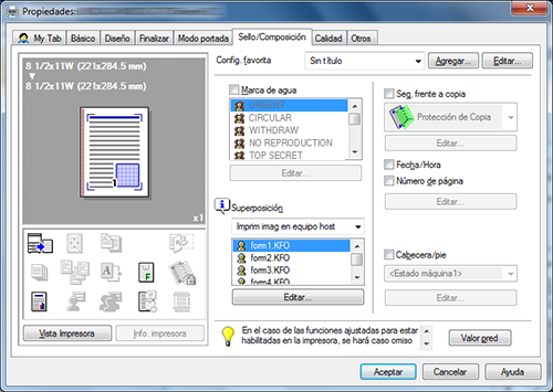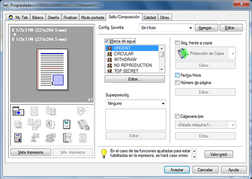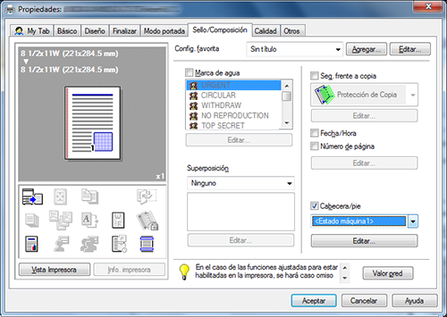 En la ficha [Sello/Composición], seleccione la casilla de verificación [Marca de agua] y, a continuación, seleccione una marca de agua.