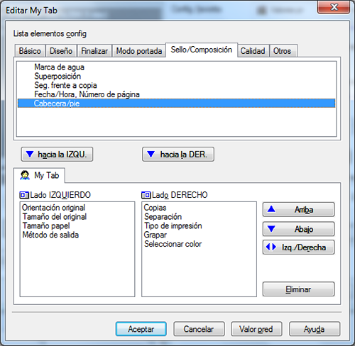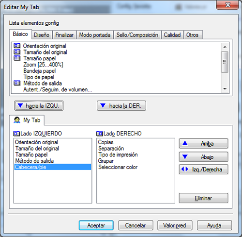 Para registrar funciones en My Tab, seleccione las funciones que desea registrar en [Lista elementos config] y haga clic en [hacia la IZQU.] o [hacia la DER.].