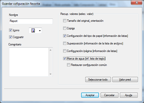 [Recup. valores (selec. valor)] | Seleccione la casilla de cada elemento que se refleja en los ajustes de la ventana de propiedades al restaurar la configuración favorita. |
