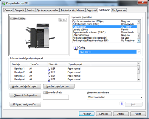 En [Opciones dispositivo] en la ficha [Configurar], seleccione [Autenticación] y, a continuación, seleccione el estado de autenticación en [Config.].