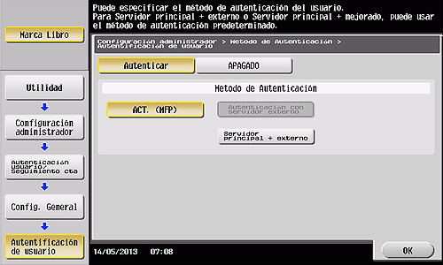 El estado de autenticación puede ser [ACT. (MFP)], [Autenticación con servidor externo], [Servidor principal + externo], [Autenticación mejorada servidor] o [Servidor principal + mejorado]. Para obtener más información sobre la autenticación de usuario basada en servidor, póngase en contacto con el administrador de servicio.