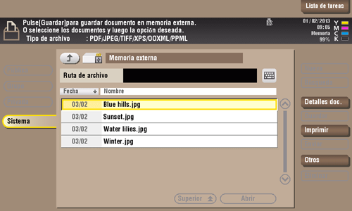 Seleccione una carpeta y, a continuación, toque [Abrir] para mostrar una lista de los documentos y carpetas que contiene la carpeta. Toque [Superior] para volver a la ubicación de una capa superior.