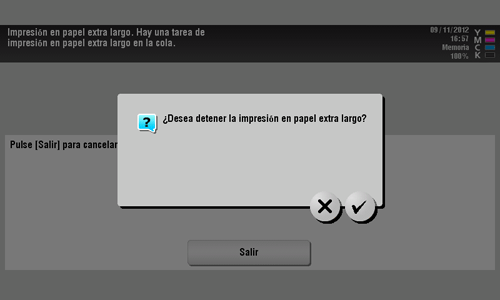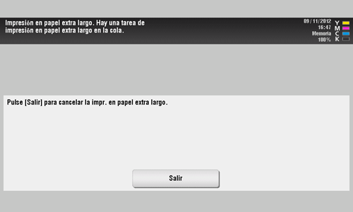 Si se recibe un trabajo de impresión con una configuración de papel de un tamaño de papel que no es extra largo mientras la máquina espera imprimir en papel extra largo, ese trabajo se pone en cola.