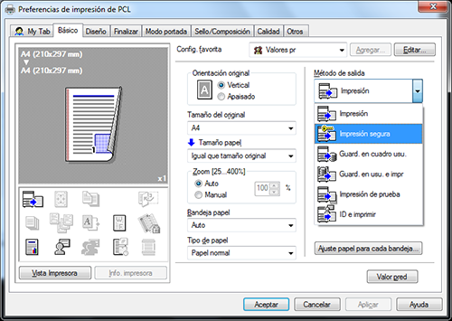 En [Método de salida] en la ficha [Básico], seleccione [Impresión segura].