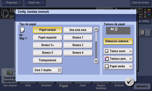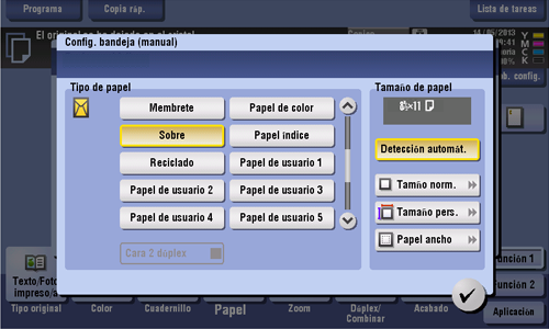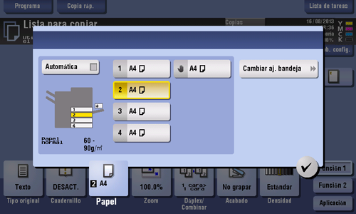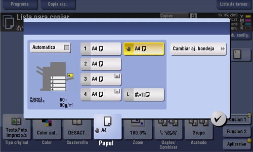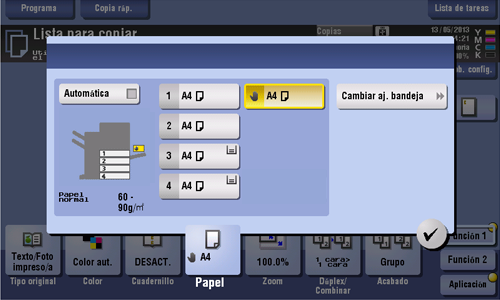 Toque [Papel] y seleccione la bandeja manual. A continuación, toque [Cambiar aj. bandeja].