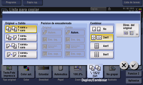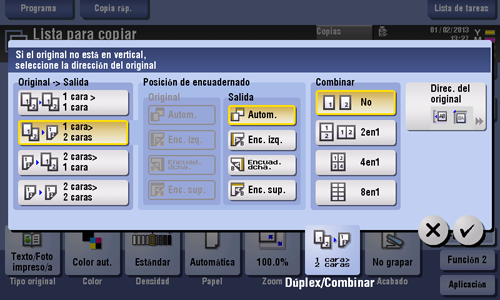 En [Original -> Salida], seleccione [1 cara > 2 caras] y, a continuación, seleccione una posición de encuadernado deseada para las salidas en [Salida].
