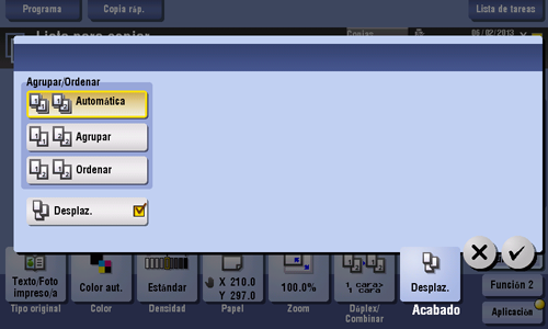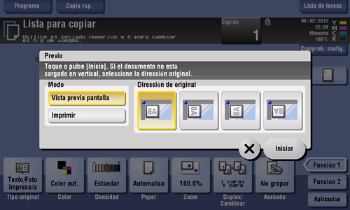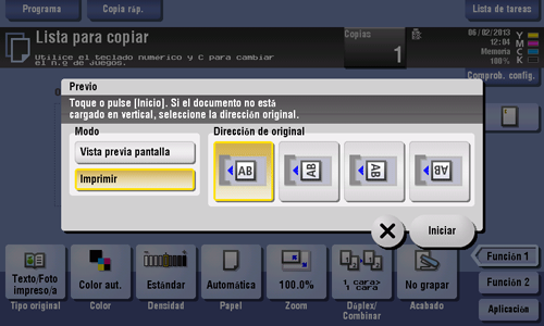 Toque [Vista previa] antes de Inicio para comprobar el acabado en el panel táctil. Para obtener información sobre el procedimiento para comprobar el acabado, consulte Aquí.