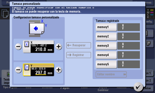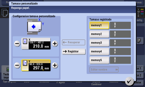 Es una buena idea disponer de los tamaños de papel personalizado utilizados con frecuencia registrados en la memoria.