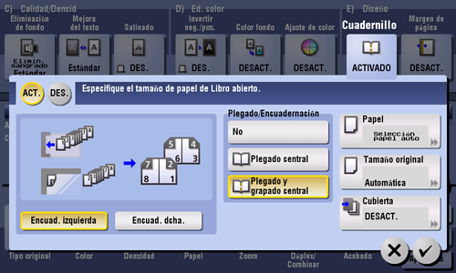 Toque [ACTIVADO] y configure los elementos correspondientes para las operaciones de impresión y encuadernado.