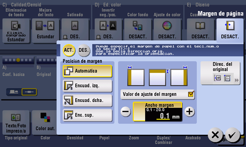 Toque [ACT.] y configure los elementos correspondientes de los márgenes de página.