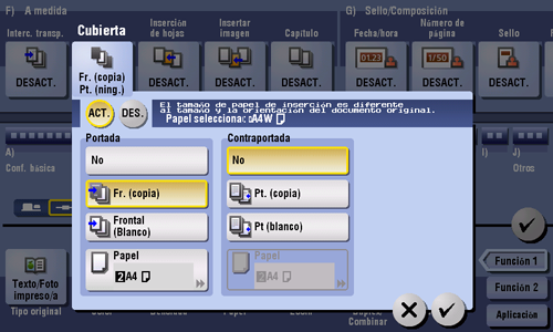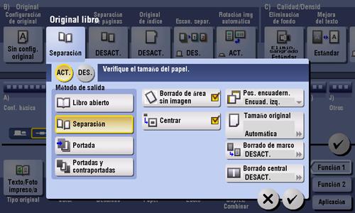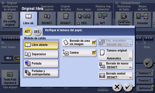 [Cubierta] | Utilice esta opción para copiar las portada y la contraportada por separado al copiar un original con portada o contraportada. Al copiar un original sin portada o contraportada, es posible utilizar esta función para introducir hojas de papel en blanco como portada y contraportada. |