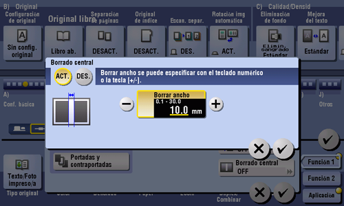 Toque [ACT.] e introduzca la anchura de las líneas de plegado que se van a borrar y, a continuación, toque [Aceptar].