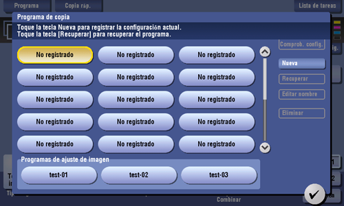 [Tamaño del original] | Introduzca el tamaño de una tarjeta para copiar. Como alternativa, puede recuperar el tamaño preregistrado desde [Tamaño registrado]. | |