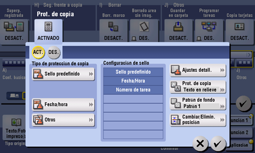 Toque [ACT.] y configure los elementos correspondientes de la función de protección de copia.