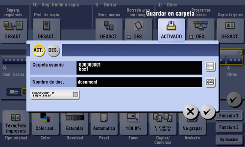Toque [ACTIVADO], seleccione la carpeta de usuario que se debe utilizar para guardar en [Carpeta usuario] y, a continuación, toque [Aceptar].