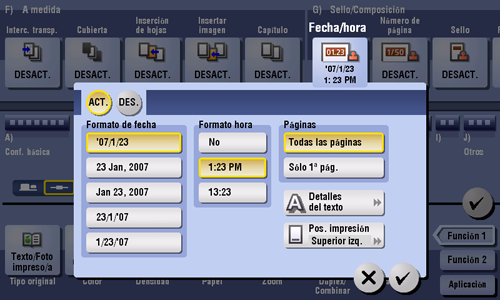 Toque [ACT.], defina los valores para [Formato de fecha], [Formato hora] y [Páginas] y, a continuación, toque [Aceptar].