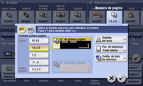 Toque [ACT.], configure los valores de [Formato número página] y [N.º de primera página] y, a continuación, toque [Aceptar].