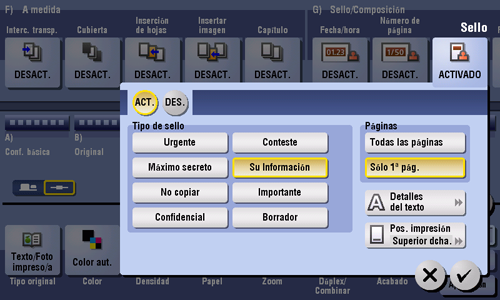 Toque [ACT.], defina los valores para [Tipo de sello] y [Páginas] y, a continuación, toque [Aceptar].