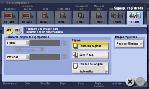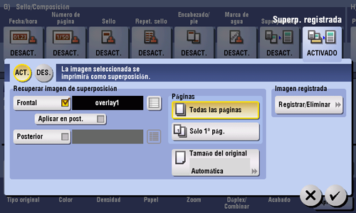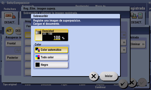 Cargue el original que contiene la imagen de superposición que se va a registrar, configure [Densidad] y [Color] según sea necesario y, a continuación, toque [Iniciar].