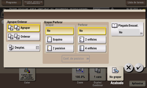 [Grapar/Perforar] | [Grapar] | Especifique el modo de grapado. |