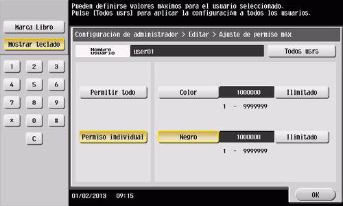 Toque [Ajuste permiso máx] y [Color] o [Negro] y, a continuación, introduzca el permiso máximo del número de originales en color/negro que el usuario puede imprimir, utilizando el teclado.