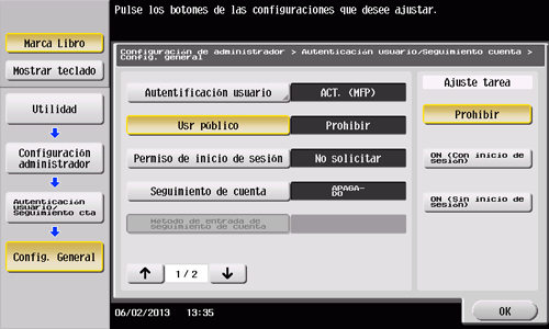 Seleccione [Usr público], a continuación [ON (Con inicio de sesión)] o [ON (Sin inicio de sesión)] y, a continuación, toque [OK].