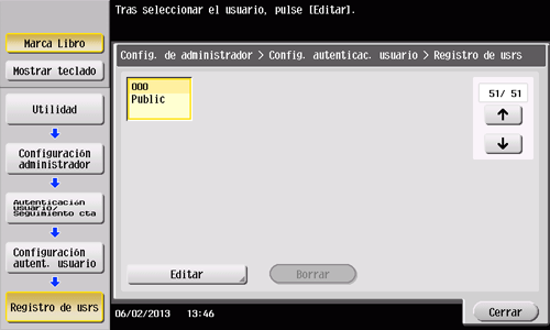 Seleccione [Autenticación usuario/Seguimiento cta] - [Configuración autent. usuario] - [Registro de usrs].
