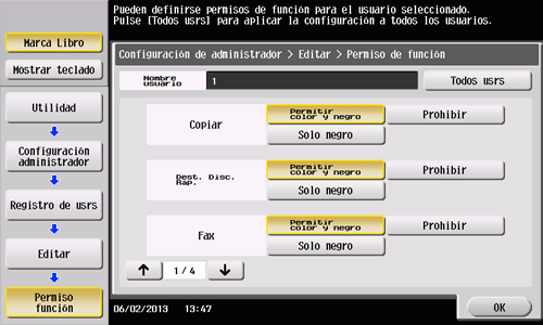 Toque [Permiso función] para configurar el límite de las funciones correspondientes.