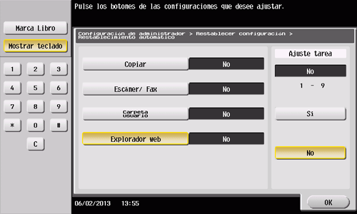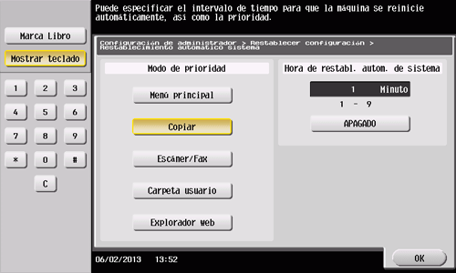 Seleccione las funciones que se deben visualizar después de un reinicio e introduzca la hora para volver a los ajustes predeterminados utilizando el teclado.
