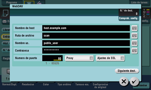 Introduzca un nombre de host del servidor WebDAV de destino o una dirección IP cuando se envíen datos de originales escaneados a un servidor WebDAV.