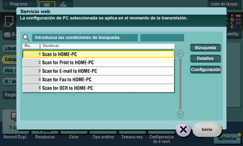 Si resulta difícil encontrar un destino porque hay demasiados destinos, toque [Búsqueda]. Seleccione un destino y toque [Detalles] para comprobar la información de destino. Para seleccionar una configuración de opciones, toque [Configuración].