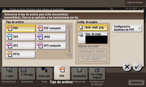 • [PDF]: la mayoría de los sistemas operativos admiten este formato de archivo. Puede especificar una contraseña o cifrar el archivo. Los datos importantes del original deben guardarse como archivo PDF.