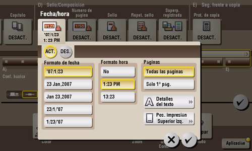 Es posible seleccionar una posición y formato de impresión, y añadir la fecha y hora. La fecha y hora pueden imprimirse en todas las páginas o únicamente en la primera.
