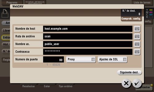 Introduzca el nombre de una carpeta de destino en el servidor WebDAV especificado en [Nombre de host] con un máximo de 142 bytes.