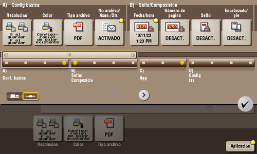 [App] | Configura las opciones de la aplicación para notificar el almacenamiento de los datos del archivo por correo electrónico, para modificar la información del remitente del fax y otras. |