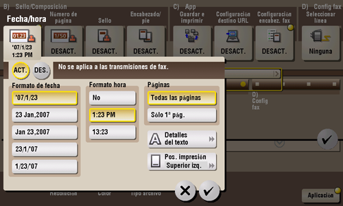 Es posible seleccionar una posición y formato de impresión, y añadir la fecha y hora. La fecha y hora pueden imprimirse en todas las páginas o únicamente en la primera.