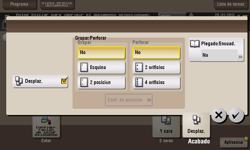 Si se ha instalado una unidad de acabado o el separador de trabajos JS-506, las hojas impresas se expulsan y apilan una encima de otra, con cada juego de copias o páginas escalonado para separarlas.