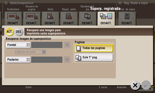 Especifique en qué cara del papel se debe componer la imagen de superposición y seleccione la imagen de superposición que se debe componer. Compruebe la densidad, método de composición, cambio de color y vista previa de una imagen de superposición si es necesario.