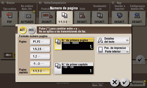 Si un original está dividido en capítulos y desea imprimir números de capítulo en el segundo capítulo, introduzca el número del primer capítulo con el teclado. Para mostrar el teclado, toque el área de entrada numérica. Solo podrá especificar números de capítulo si ha seleccionado [Página capítulo] en [Formato número página]. Por ejemplo, para imprimir los números de capítulo a partir del tercer capítulo, introduzca "-1". El primer capítulo del archivo se cuenta como "-1", el segundo capítulo como "0" y el tercer capítulo como "1". En [Nº de primer capítulo], el número del capítulo se imprime en los capítulos que se cuentan como 1 y siguientes. Si se introduce "2", el número se imprime desde la primera página del primer capítulo del archivo como "2-1, 2-2". "-" (signo menos) cambia a + cada vez que se toca [*].