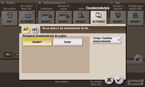 Seleccione [ACT.] para imprimir el encabezado/pie de página.